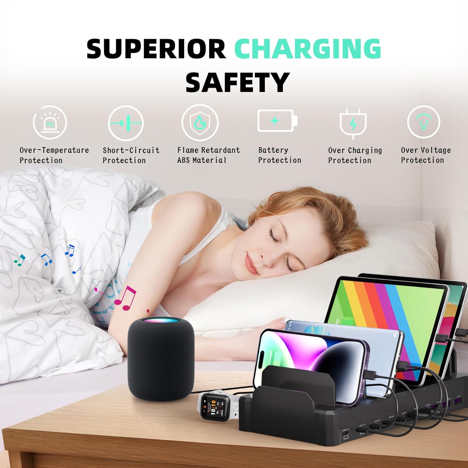420W Charging Station for Multiple Devices, Zobirez 10-Port USB C Fast Charger Stations for MacBook, iPhone, Android Cell Phone, iPad, Tablet, Family Multi-Device Organizer…