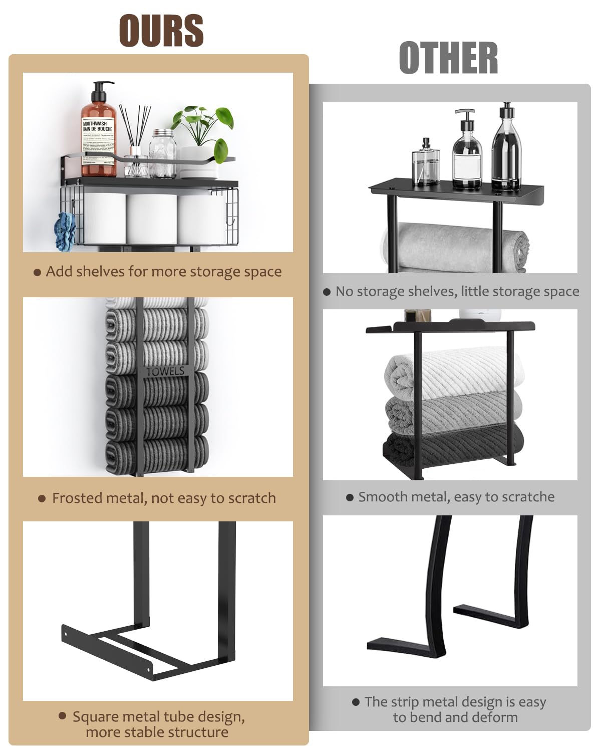 Aetyord Towel Racks for Bathroom 31inch Wall Mounted Towel Rack,Floating Shelf with Wood Plank,Towel Storage for Bathroom can Holds 6 Large Rolled Towels,All Black