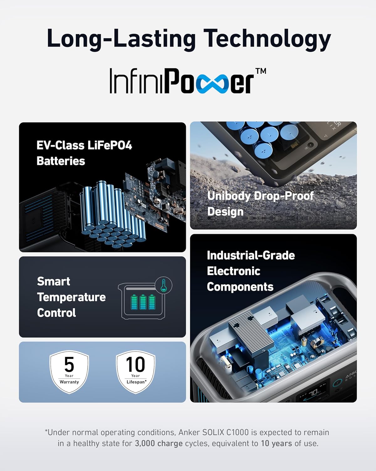| Included Components | Anker SOLIX C1000 Portable Power Station, solar panel connector, AC charging cable, car charging cable, user manual |