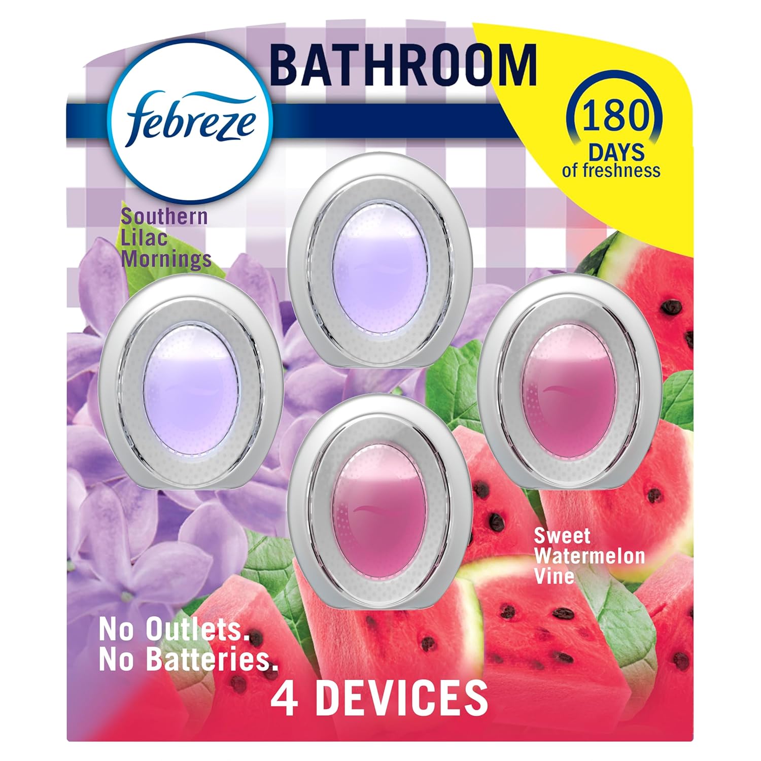 Febreze Bathroom Air Freshener, Odor-Fighting, Plug In Alternative, Air Fresheners for Home and Bathroom and Kitchen, Closet Air Fresheners, Watermelon & Lilac Scent, 4 Count