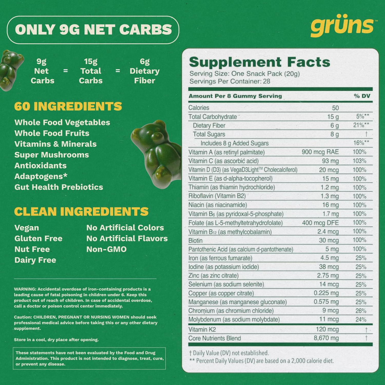 Gruns Adults Super Greens Multivitamin Gummies, Superfood Vitamin Gummy Bears with Spirulina, Chlorella, Prebiotic Fiber for Digestive Health, Adaptogens Supplement, 20 Vitamins…